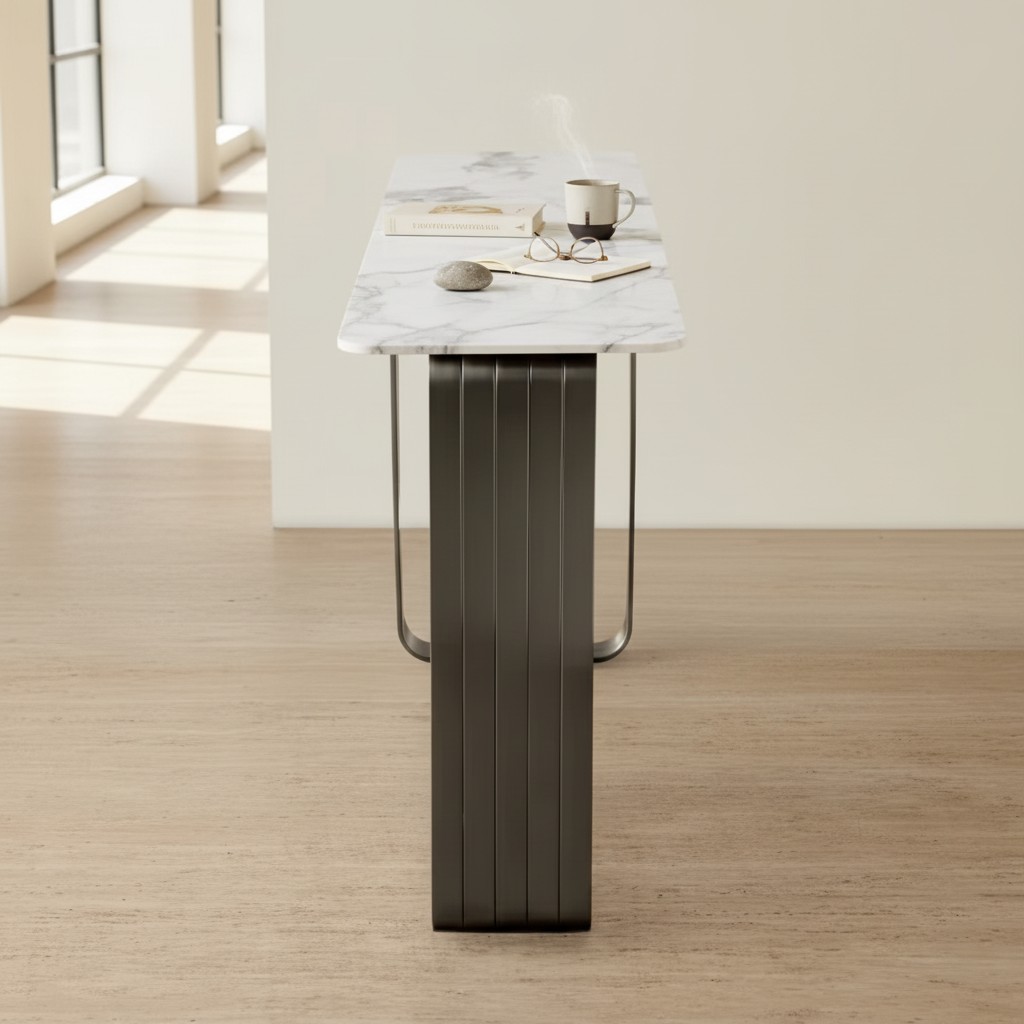 Its slim, streamlined profile makes it ideal for entryways, hallways, or behind sofas, offering a stylish surface for décor, lighting, or everyday essentials. The stone-inspired tabletop captures the beauty of natural marble while providing superior resistance to heat, scratches, and stains—perfect for daily use.