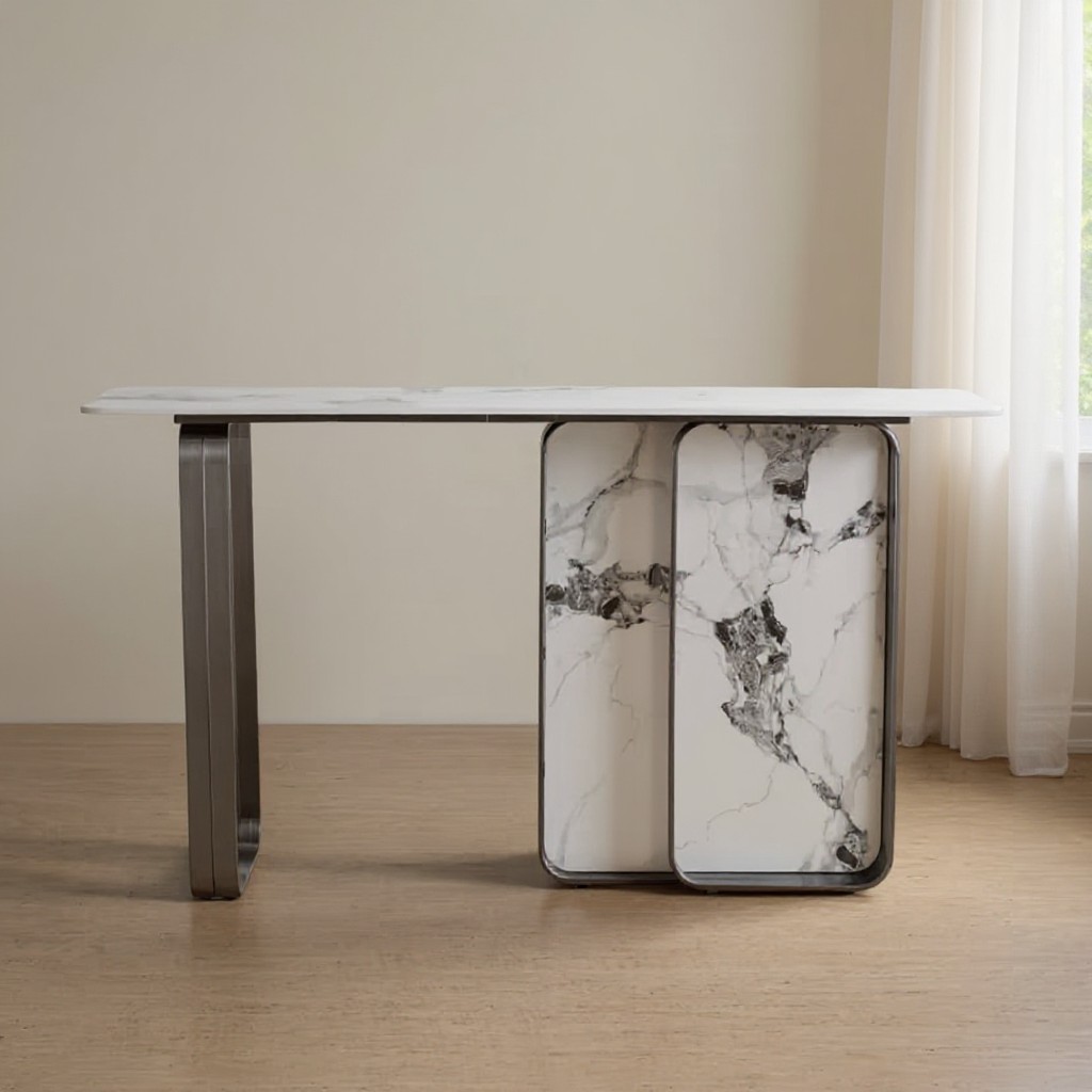 Enhance your home with this modern sintered stone console table, designed to deliver a perfect blend of elegance and practicality. Featuring a sleek white sintered stone top paired with a bold black stainless steel base, this piece creates a sophisticated focal point in any contemporary interior.