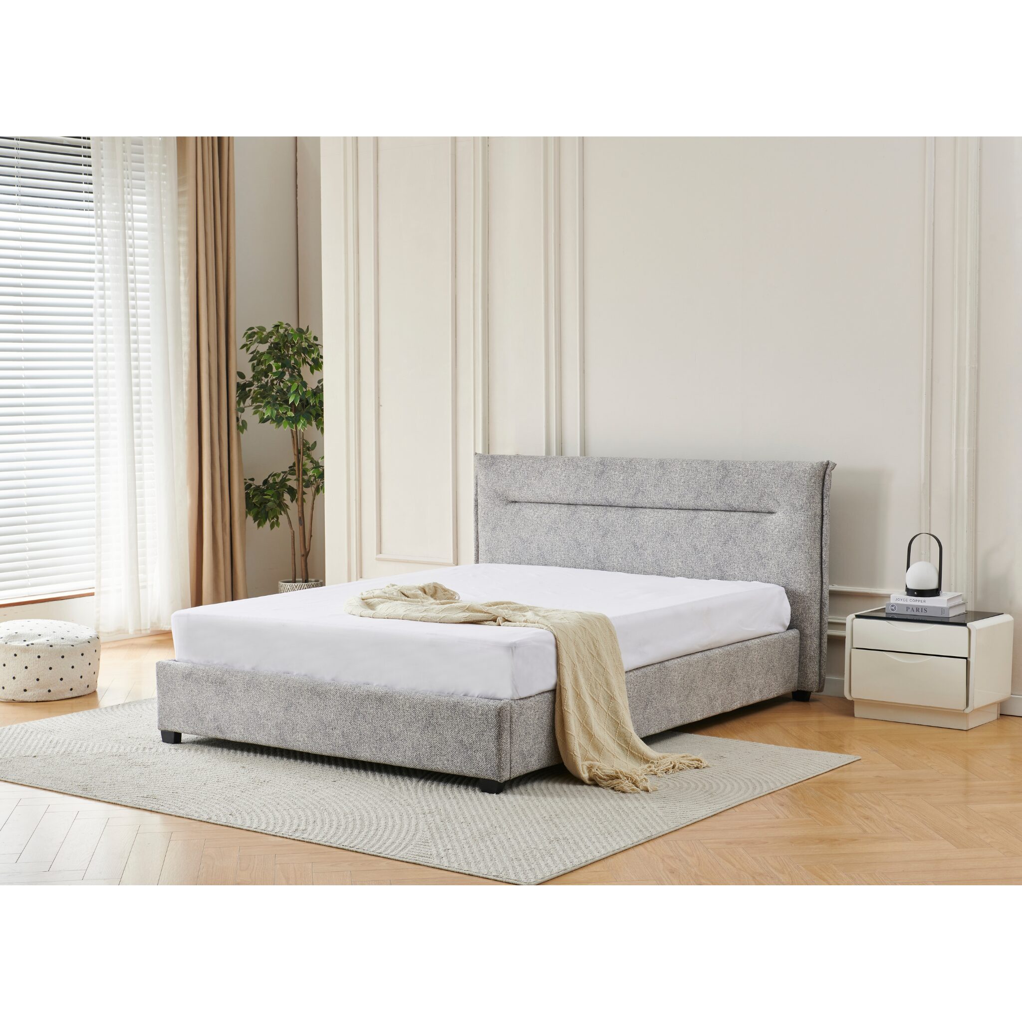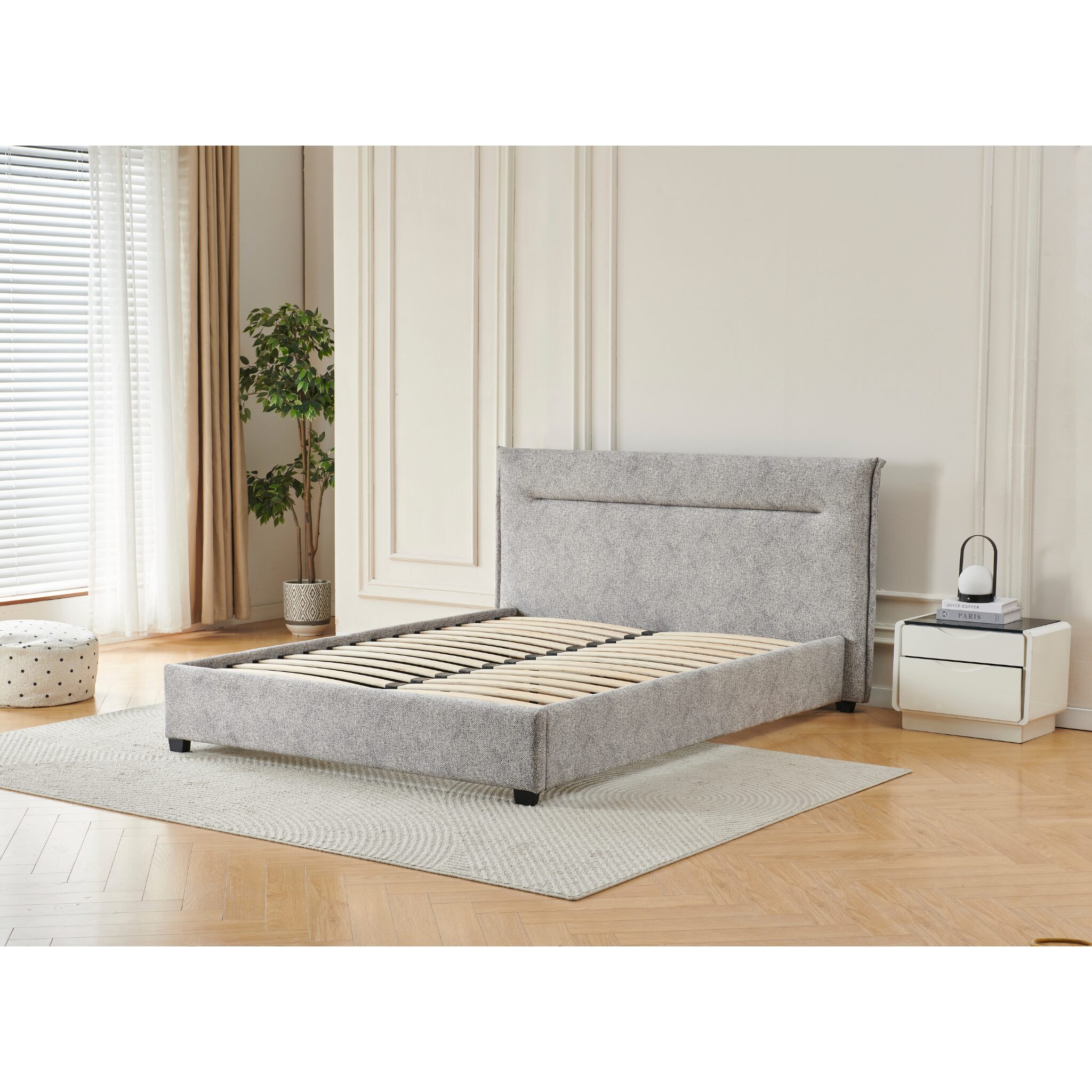 Bring modern simplicity and everyday comfort into your bedroom with the Tilicho Double Bed Frame. Upholstered in textured heather-grey fabric, this bed frame features a gently angled headboard that adds a subtle, contemporary touch while providing supportive comfort.